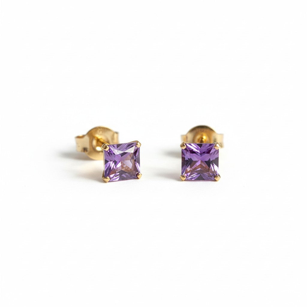 Oorbellen – RVS Goudkleur met Paarse Vierkante Zirkonia (5mm)