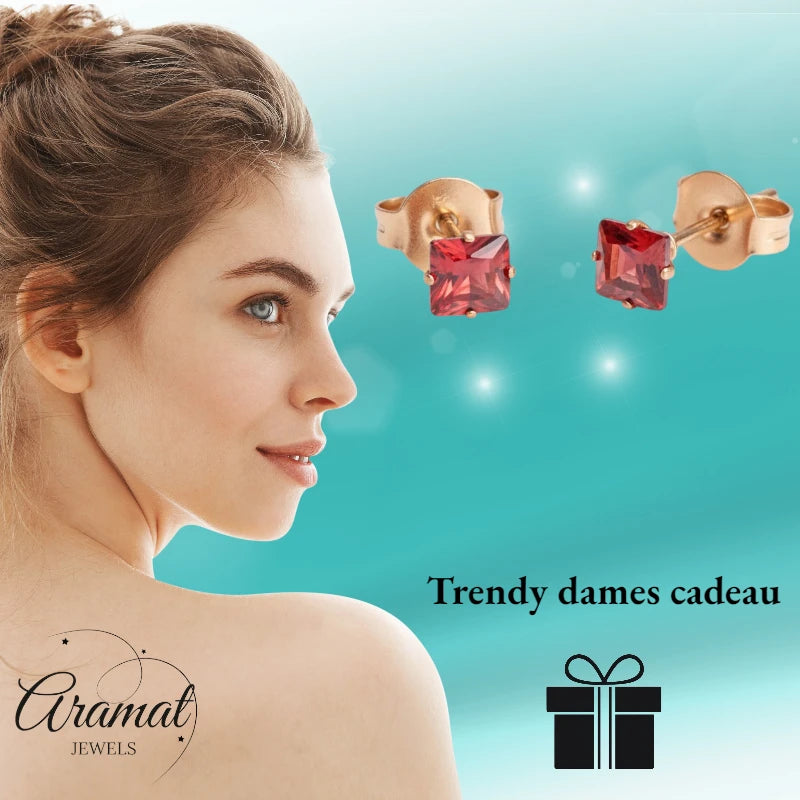 - Bevatten deze oorbellen stenen? Ja, deze oorbellen zijn voorzien van een vierkante rode zirkonia steen met een diameter van 4mm.