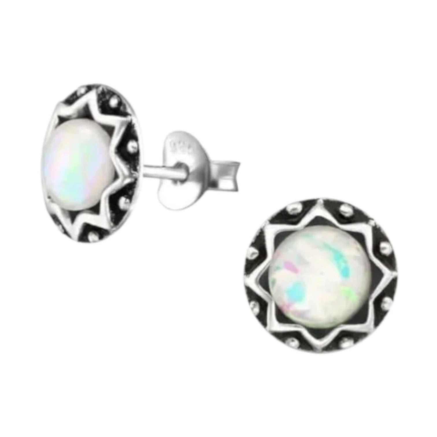 Oorstekers – Sterling Zilver Bali Etnisch Wit Opaal 9mm Rond Geoxideerd
