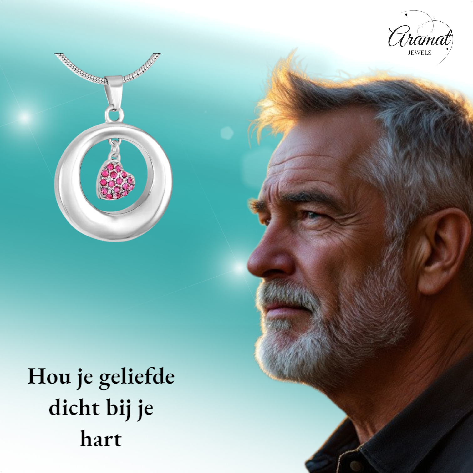 Give your loved one a loving place close to your heart with this open circle ash pendant featuring a sparkling pink crystal heart . Crafted from polished stainless steel , the pendant exudes strength and softness. The heart, set with pink crystals, catches the light, making this memorial piece extra special. This stylish ash pendant is ideal for adults seeking a symbolic, tangible keepsake. 💗