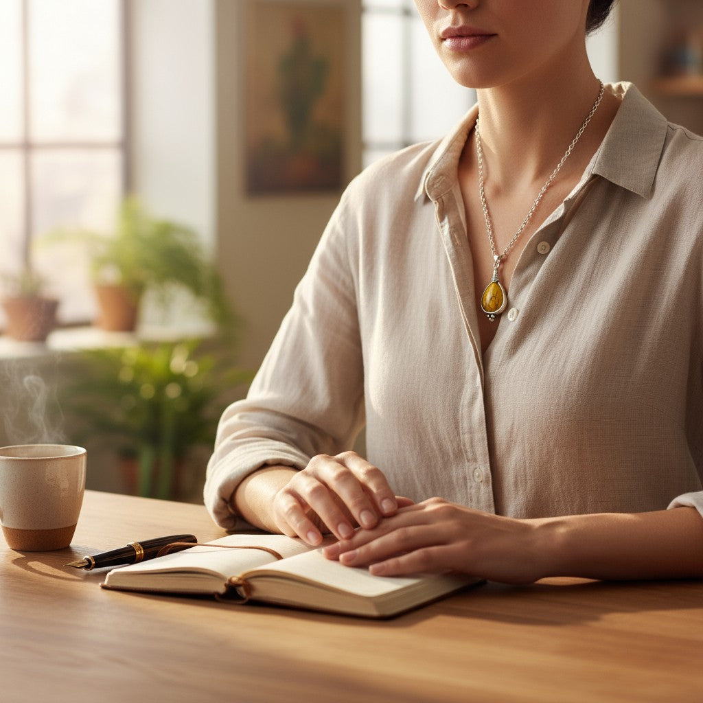 This unique pendant necklace is crafted from durable zinc alloy and features a bright yellow synthetic stone . The antique silver finish gives it a vintage look that complements both casual and formal outfits.