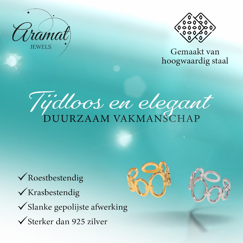 Dit sieraad is vervaardigd uit sterk roestvrij staal (RVS). RVS is bekend om zijn duurzaamheid en weerstand tegen verkleuring. Dit maakt de ring uitstekend voor dagelijks gebruik.