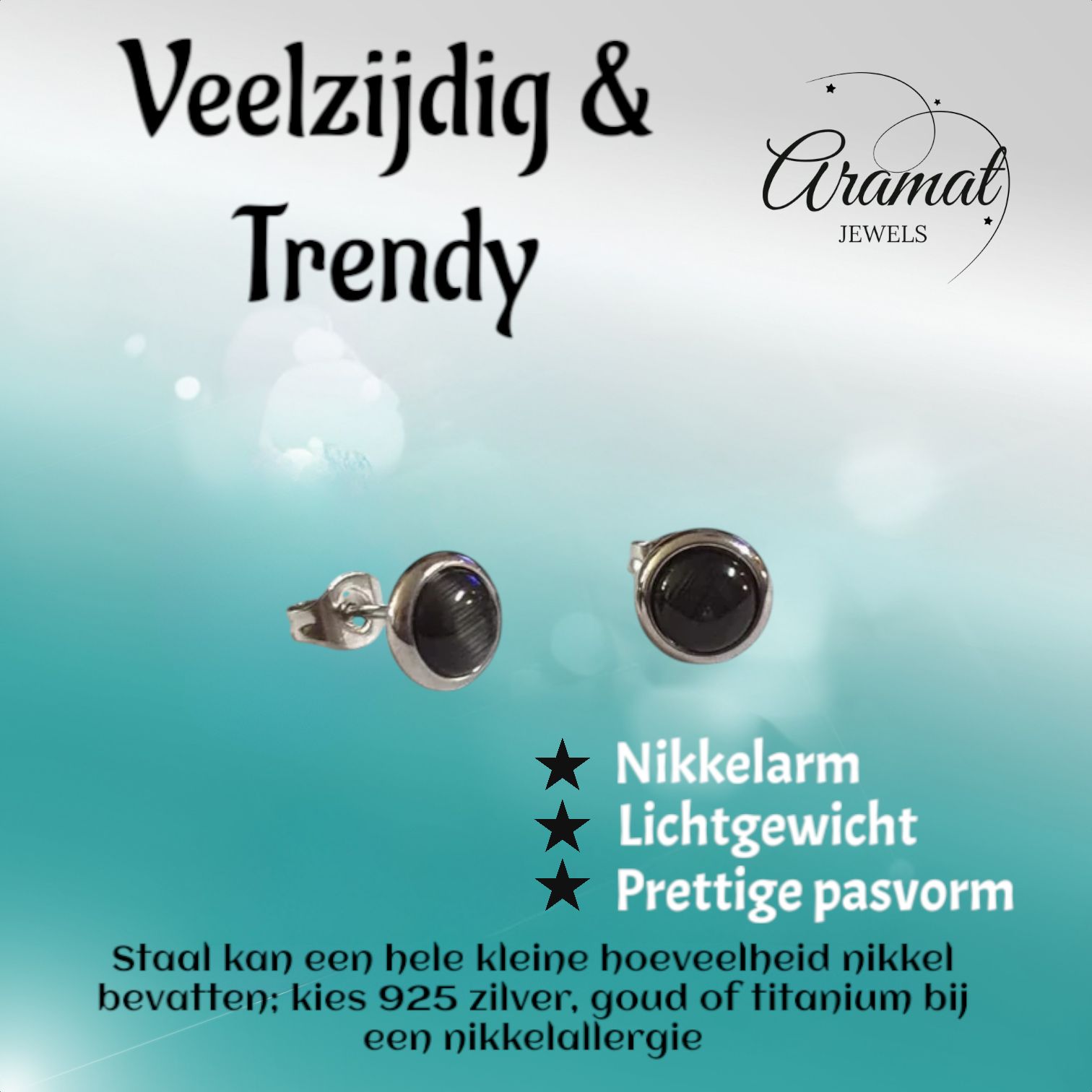 These 8mm cat's eye earrings instantly give your look an edgy vibe. They look beautiful solo, but also stand out when paired with silver-colored jewelry or a minimalist necklace .