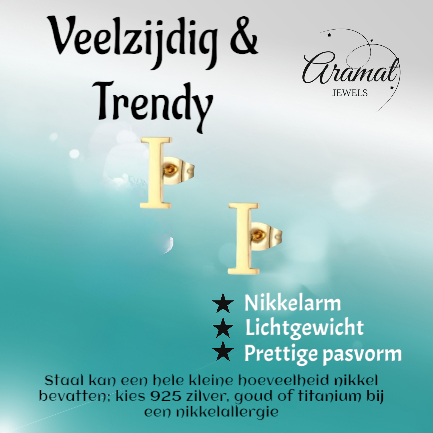 These are gold-colored stainless steel letter I stud earrings from Aramat Jewels, suitable for any age and low in nickel .
