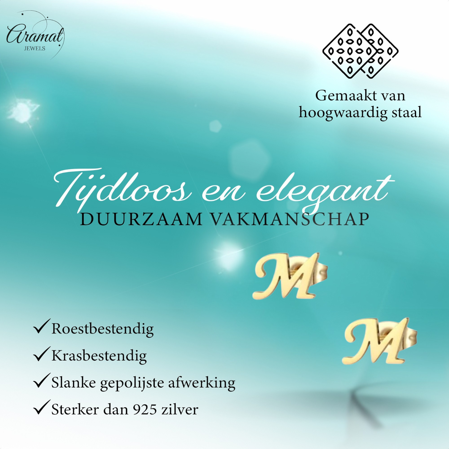 These are gold-colored stainless steel stud earrings with the letter M , suitable for every ear and low in nickel .
