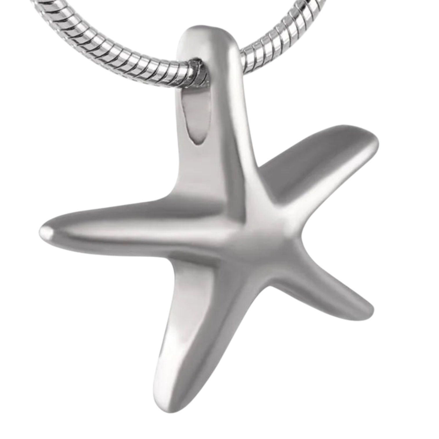 This silver-colored starfish-shaped ash pendant is a unique piece of mourning jewelry that allows you to always carry the memory of a loved one with you. The starfish represents hope, eternal connection, and strength after loss. Its compact size and polished finish make this cremation pendant stylish and subtle, perfect for everyday wear. A beautiful keepsake that offers comfort and complements any style.