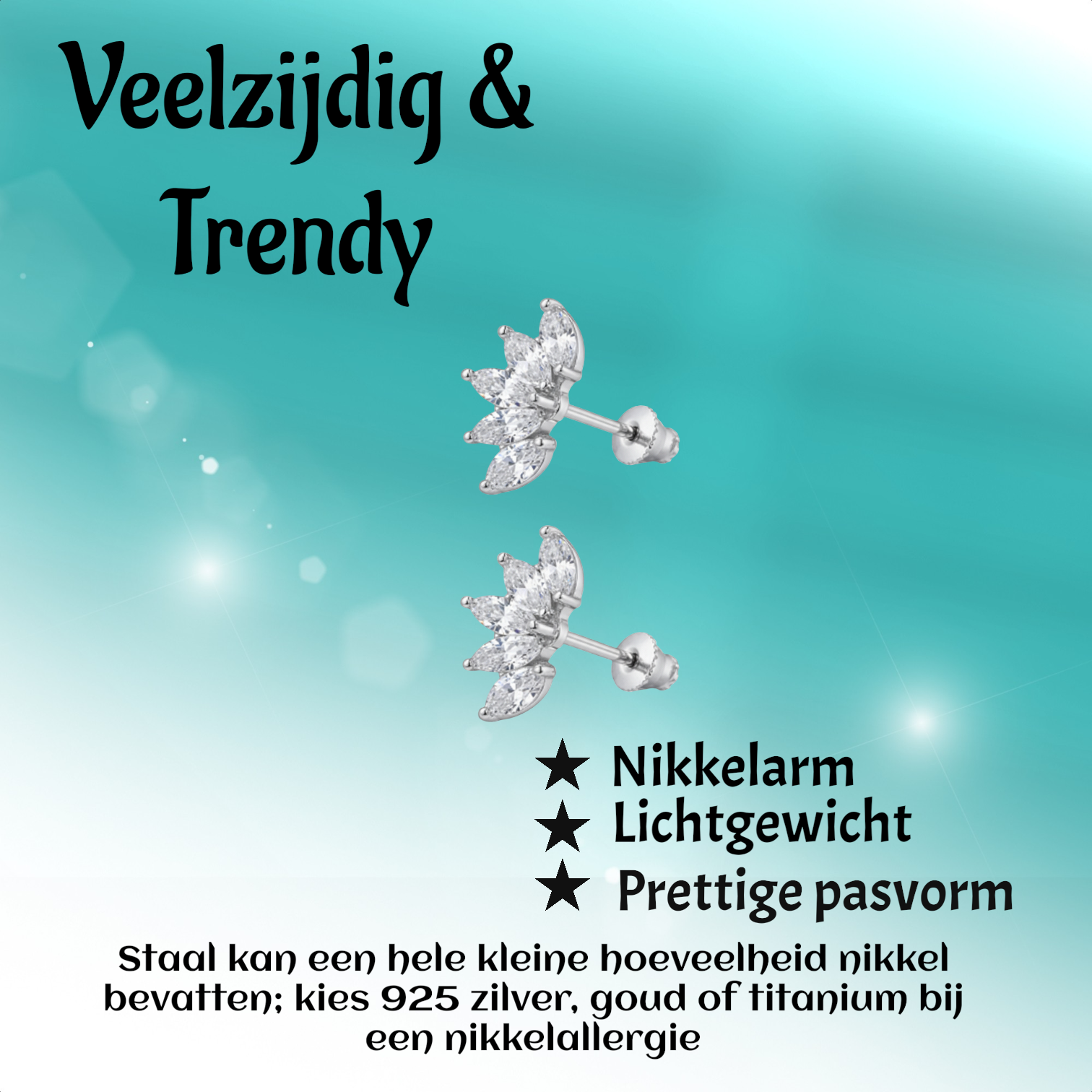 Deze oorstekers zijn vervaardigd van hoogwaardig roestvrij staal (RVS). Dit RVS sieraad is volledig waterproof en zal bij normaal gebruik niet verkleuren. Let op: bij sieraden met steentjes adviseren wij altijd om ze af te doen tijdens het douchen. Water en zeepresten kunnen de schittering van de zirkonia na verloop van tijd dof maken of de lijm van de zirkonia's oplossen.
