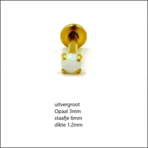 The barbell is 6 mm long and 1.2 mm thick. These are the standard and most commonly used sizes for most cartilage piercings. The round stone is made of synthetic opal and has a diameter of 3 mm. The white opal reflects light with a soft, iridescent glow. The gold plating on the steel creates a luxurious look. 💛