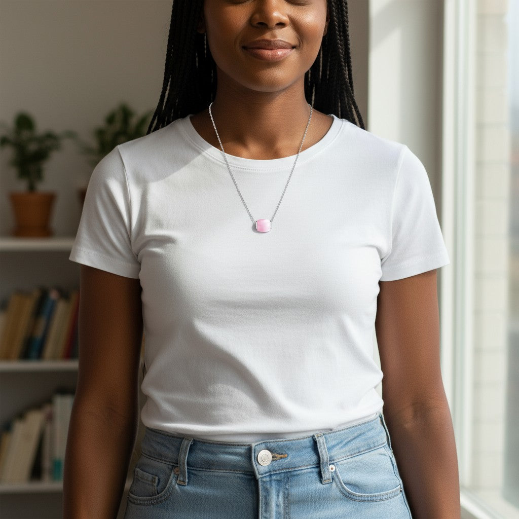 The Aramat Jewels® Women's Silver Necklace with Pink Cat's Eye Stone is a beautiful combination of elegance and enchanting beauty.