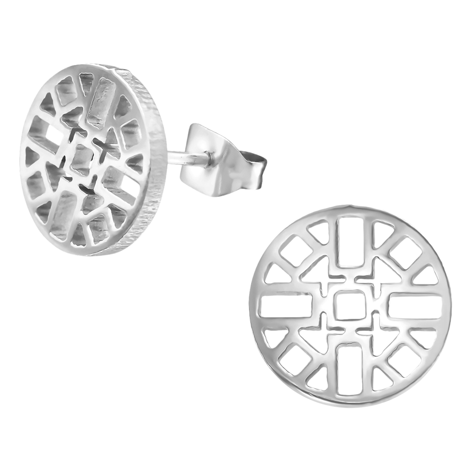 Express your style with these 10mm silver-tone steel earrings featuring an openwork Aztec motif . A perfect blend of geometry, symbolism, and elegance—especially for teens and women who love unique earrings. 💫