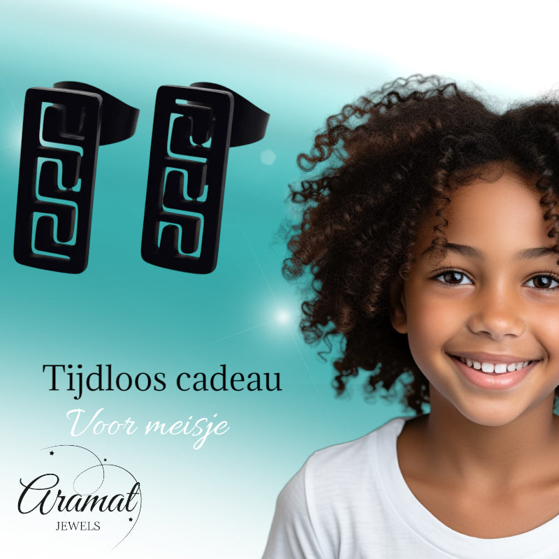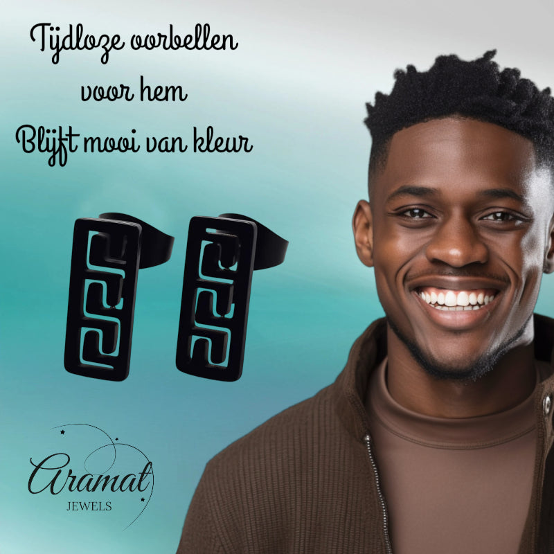 🌟 Aramat Jewels® – Black Steel Bar Earrings with Greek Motif